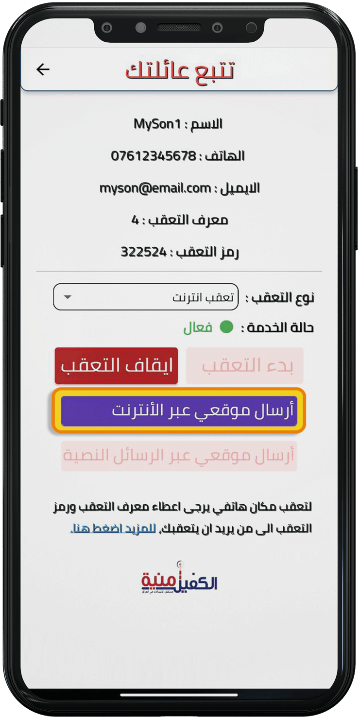 يمكن للحساب الفرعي ارسال موقعه عبر الانترنت بالضغط على زر “ارسال موقعي عبر الانترنت” حتى وان كانت حالة التعقب متوقفة حيث تمكنة من تحديث الموقع انيا.