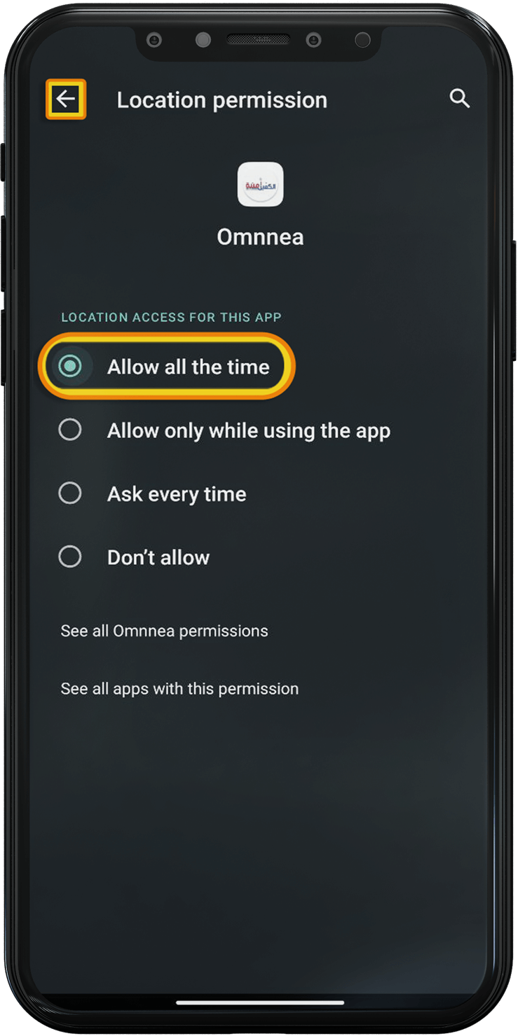 عند الضغط على بدء التعقب لأول مرة فقط سيطلب البرنامج الترخيص للوصول الى خدمة تحديد الموقع لنظام تشغيل الاندرويد بالإضافة الى صلاحية استعمال البطارية بدون قيد او شرط… لأعطاء الصلاحيات المطلوبة لعمل البرنامج بصورة صحيحة وبدون توقف، يرجى اتباع الخطوات الاتية: