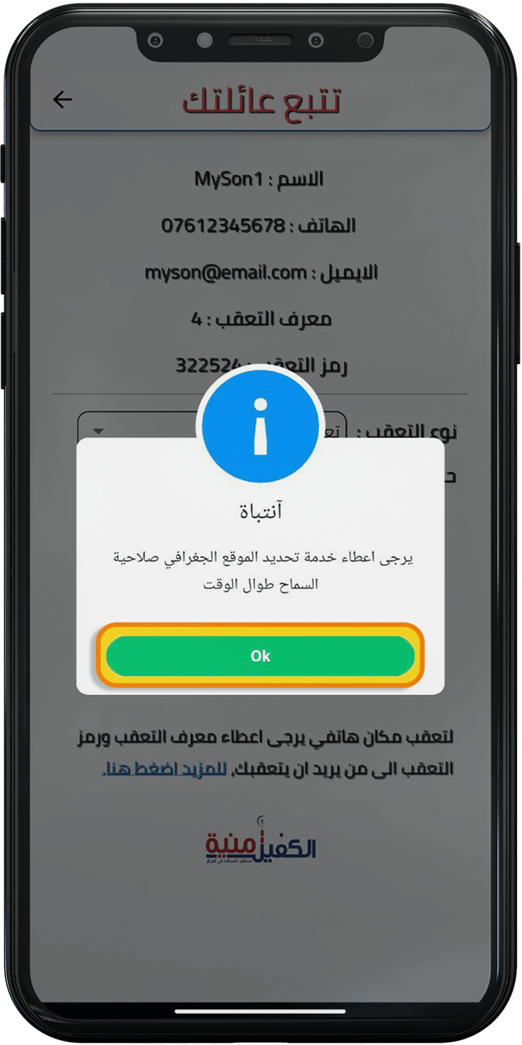يرجى الانتباه الى ان مشاركة معلومات التعقب (معرف التعقب، رمز التعقب) تصرح لمستخدميها بتعقب موقعك ان كانت حالة التعقب فعالة.